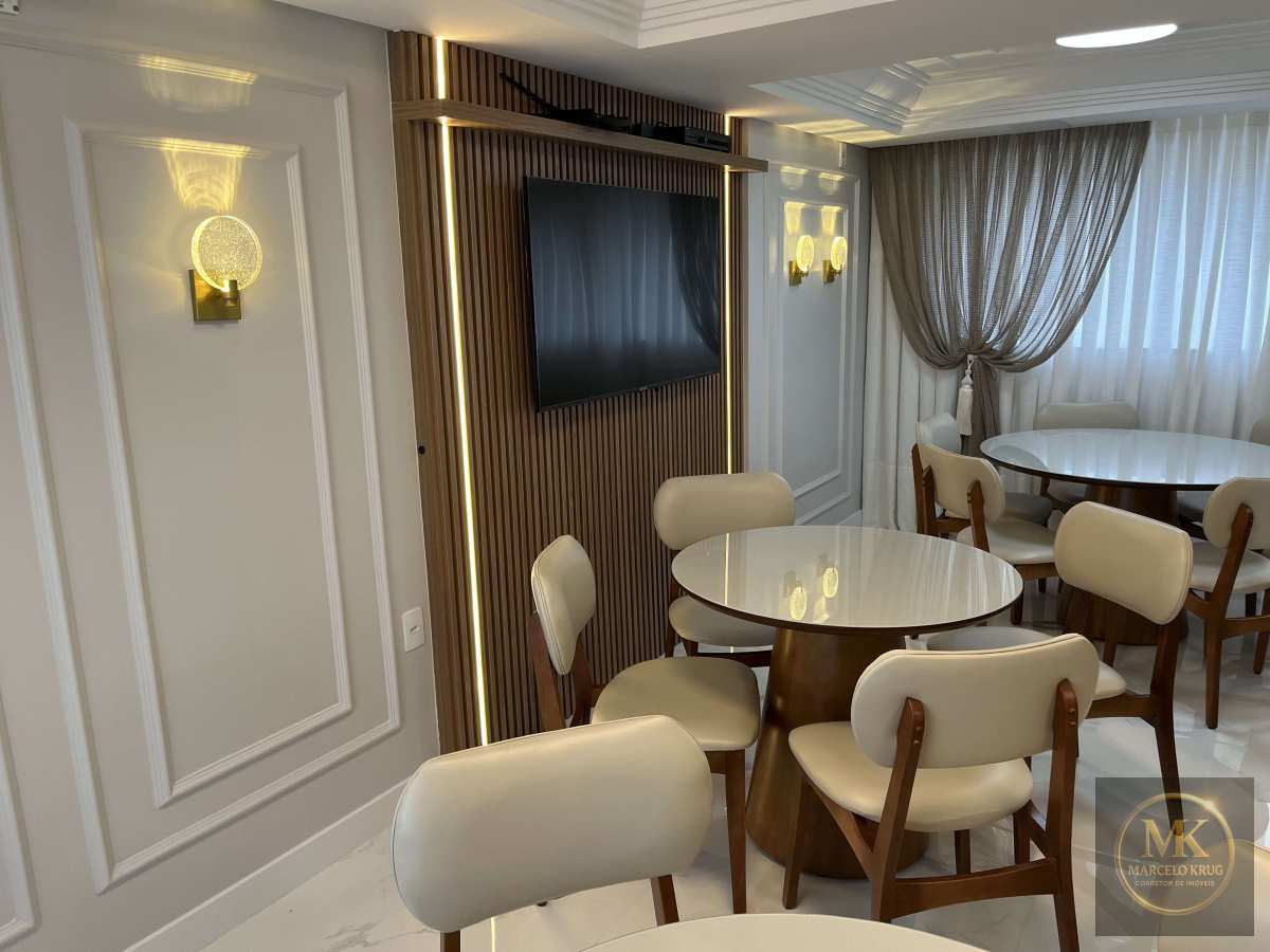 Salão de festas e espaço gourmet mobiliados e decorados